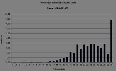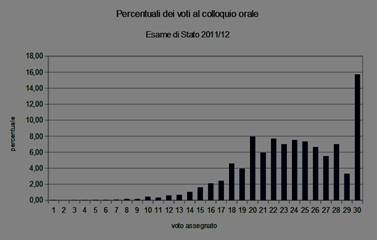 Nella figura qui a fianco e in quella successiva vengono raffigurati gli istogrammi delle percentuali delle valutazioni orali all'esame di Stato del 2011/12 e del 2014/15 (4). Si noterà in particolare la significativa discontinuità nella valutazione del 30, con un po' più di attenzione, si noterà anche quella del 20 (ma anche quelle poste a “-2” da tali soglie, cioè quelle del 18 e del 28). La particolarità della prima coppia di voti (20 e 30) è che il primo è il massimo possibile, mentre il secondo rappresenta il livello di sufficienza, cioè rappresenta una soglia. La seconda coppia di voti rappresentano comunque una soglia psicologica degli insegnanti che, avendo nel primo caso un'esperienza vissuta sul tema degli esami universitari e la loro scala valutativa, hanno introiettato il 18 come valore di sufficienza; per entrambi i voti della seconda coppia si tratta anche di “soglia tecniche/psicologiche” che esplicitano un colloquio insufficiente, o molto buono (ma non ottimo) per il quale la commissione fornisce un risultato numerico che non vuole essere troppo penalizzante e, comunque, autocautelativo. Da un punto di vista astratto, la griglia di valutazione utilizzata dalle commissioni dovrebbe fornire, almeno sulla popolazione nazionale, curve più morbide/continue, ma l'interferenza di elementi cogenti della realtà dell'esame sulle griglie, appare evidente.