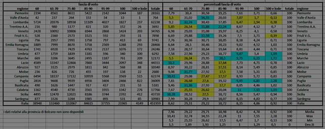 Nella figura più sotto sono indicati i voti conseguiti nell'a.s. 2014/15 dagli studenti in uscita dalla SSSG, suddivisi per regioni. Nella prima parte della tabella si trovano i valori assoluti, nella seconda quelli percentuali. In questa seconda parte ho proposto un'elaborazione che evidenzia i valori significativamente sotto o sopra la media (di una deviazione standard). Si osserverà come gran parte dei valori, quelli a sfondo bianco, sono entro valori accettabili di scostamento dalla media, mentre quelli a sfondo colorato segnalano differenze che, dal nord a sud, passano dal sopramedia a sinistra per i voti bassi e sottomedia a destra per i voti alti in settentrione, per giungere ad un'inversione scendendo verso il sud. Appaiono significativi i valori sopramedia del voto minimo in Sicilia, Lazio e Campania (dove, statisticamente, non si nega il diploma a nessuno, sancendo un valore empirico di diffidenza per il voto minimo, sessanta centesimi, largamente percepito in tutto il paese). Si confermano le tesi giornalistiche relative allo scarso numero di voti massimi al nord, le regioni più penalizzate sono la Valle d'Aosta, Lombardia e Friuli Venezia Giulia, mentre sono significtivamente sopra la media non solo un paio di regioni del sud (Puglia e Calabria), ma anche del centro (Umbria e Marche) (6).